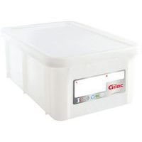 Műanyag élelmiszertároló HACCP tanúsítvánnyal, 40x30 cm és 60x40 cm téglalap alakú. Nagy tárolókapacitásokhoz. Újraírható azonosító kazetta a készletnyilvántartáshoz. Rögzítőfelületek nélküli változat. Süllyesztett fogantyúk a jobb kezelhetőség érdekében. Fedél nélkül egymásra rakható. Kompatibilis az összes Gilac 4 és 6 vázzal. Hűtött/fagyasztott