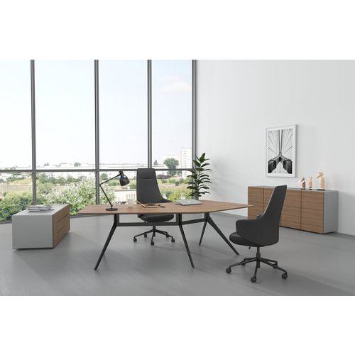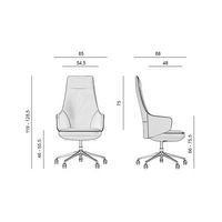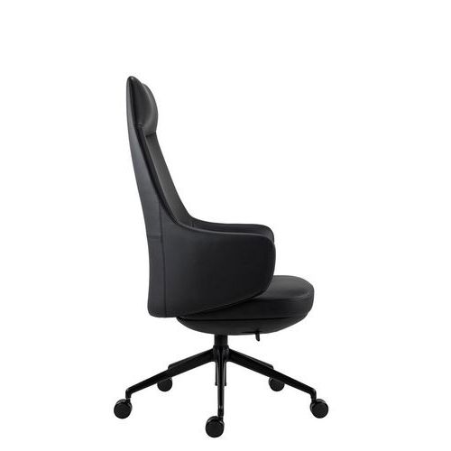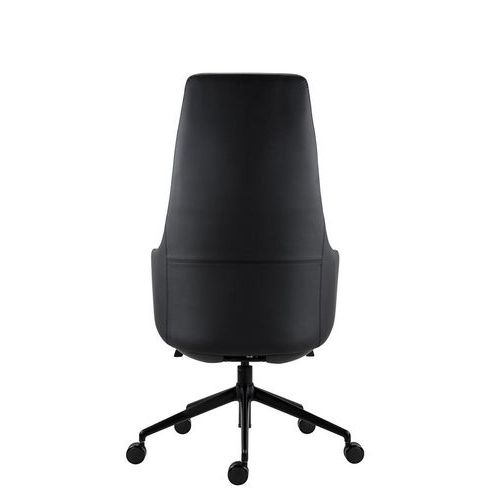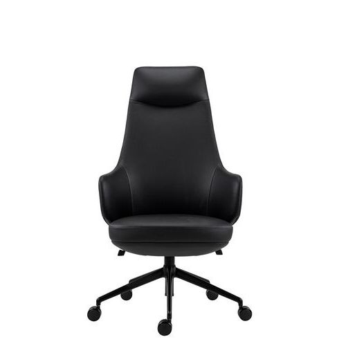 Teljesen kárpitozott luxusfotel magas háttámlával és integrált kárpitozott kartámaszokkal. Háttámla oldalsó törzsvonalvezetéssel és optimális deréktámasztékkal. A tapintható részeken finom marhabőr borítás, a többi felületen szintetikus bőr - mikroszálas bőr. Széles, nagyon kényelmes ülés finom perforációval az oldalakon, a légáteresztő képesség növelése érdekében. Hosszú élettartamú, formába fröccsöntött hideghabbal párnázva. Szinkronmechanizmus automatikus ellensúly-beállítással és háromfokozatú rögzítéssel. Ø700 mm-es alumínium kereszttartó, matt fekete festéssel. Ø 60 mm-es kerekek gumibevonattal, minden típusú padlóhoz. A szék teherbírása 150 kg.