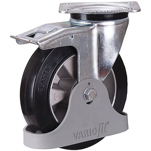 Elasztikus gumi kerekek öntött alumínium keréktárcsán, precíziós golyóscsapágyakkal. A fékezett forgó kerekek lábvédelemmel vannak felszerelve. Alacsony zajszint, alacsony gördülési ellenállás. Hőállóság -20 és +80 °C között, magas kopásállóság. Keménység 72° Shore A.