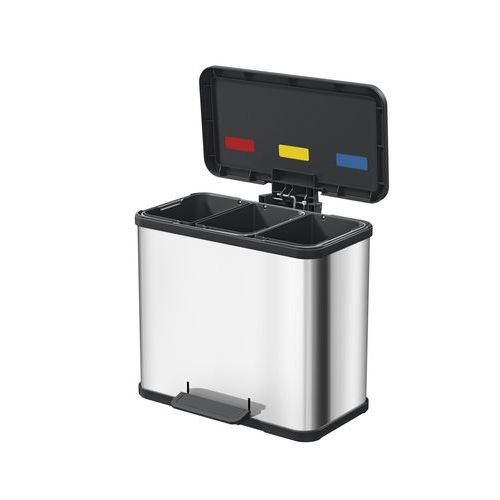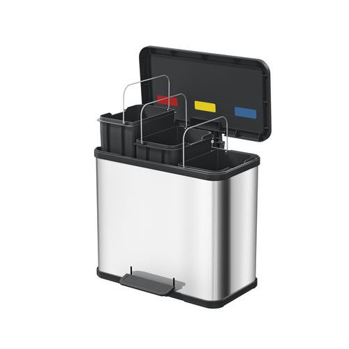 A fém szemetes kosarak három tartályt tartalmaznak szelektív hulladékhoz. A fehér és ezüst változat porfestékkel lakkozva rozsdaálló kezeléssel. A rozsdamentes acél változat nemesacélból készül.