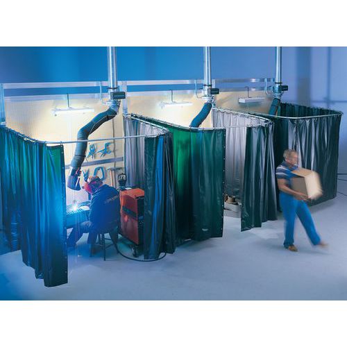 önoltó PVC-ből készül, lobbanáspont 320 - 390°C megszűrik a káros fényszikrákat hegesztésnél, az EN1598 szerint részlegesen infravörös fényelnyelők és védenek vakítás és szétforgácsolódótól az akasztógyűrűk merevített nyílásai megakadályozzák a esetleges leszakadást patentkapcsokkal vannak ellátva a függönyök kölcsönös összekapcsolásához acél akasztógyűrűkkel együtt szállítjuk