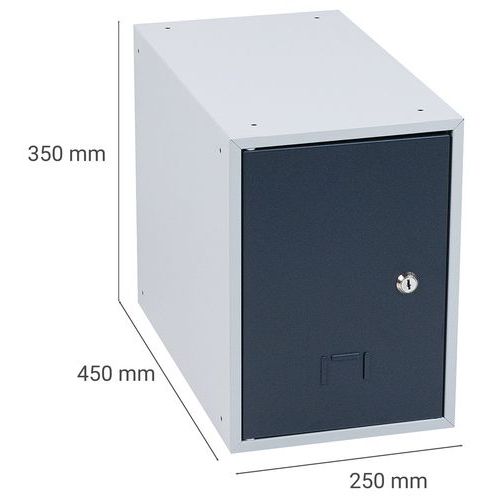 Öltözőboxok az öltözőbox-fal összeállítására. Stabil fém szerkezet, lemezvastagság: 0,7 mm, porlakkos felületkezeléssel. A boxok külön zárhatók hengerzárral. Az ajtók rejtett pántokon vannak felakasztva, és akár 180°-os szögben is nyithatók. Névtábla helyezhető el az ajtókon. A furatok a boxos öltözőfal egyszerű összeállítására szolgálnak.