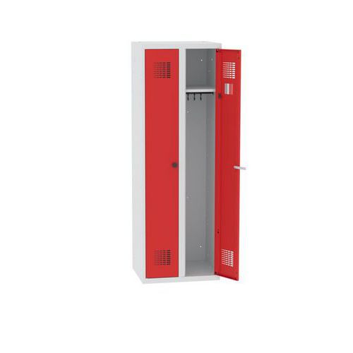 Hegesztett takarítószekrény Chloe, 2 rekesz, szélesség 600 mm, hengerzár, szürke/piros Hegesztett takarítószekrény Chloe, 2 rekesz, szélesség 600 mm, hengerzár, szürke/piros