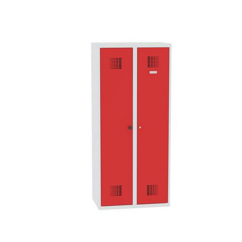 Hegesztett szekrények, alkalmasak takarítóeszközök tárolására. A bal és jobb oldali ajtónyitás gyors hozzáférést biztosít a szekrény egészéhez. A szekrény két részre van osztva, az egyik négy polccal, a másik egy polccal a szekrény felső részén. 0,5 mm vastag acéllemezből készültek, megerősített hegesztésekkel. A szekrény ajtaján lévő szellőzőnyílások hatékonyan elvezetik a nedvességet. A jobb oldali szárny egypontos hengerzárral zárható, a bal oldali szárny alumínium gombbal nyitható. A névtábla elhelyezhető a ajtó felső részén. Porfestékkel bevont felület.