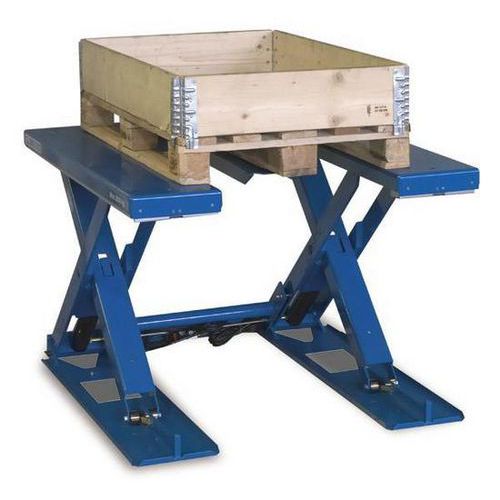 - Az E alakú max. 1000 kg teherbírású hidraulikus asztal a raklapkocsival való megközelítésre és a raklapok emelésére tervezték.