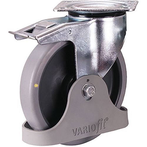 Szürke, hőre lágyuló gumi kerekek műanyag peremen, precíziós golyóscsapágyakkal. A keréktest elektromosan vezető polipropilénből készült, elektromos ellenállása kevesebb, mint 1 000 000 ohm. A fékezett forgó kerekek lábvédelemmel vannak felszerelve. Szürke foltmentes futófelület. Alacsony zajszint, alacsony gördülési ellenállás. Hőállóság -20 és +80 °C között, magas kopásállóság. Keménység 65° Shore A.
