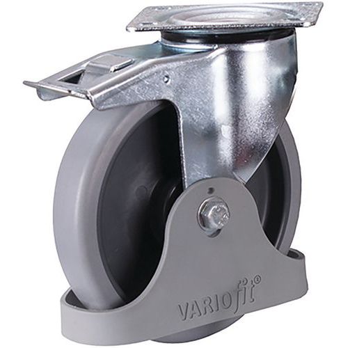 Szürke, hőre lágyuló gumi kerekek műanyag peremen, precíziós golyóscsapágyakkal. A fékezett forgó kerekek lábvédelemmel vannak felszerelve. Szürke foltmentes futófelület. Alacsony zajszint, alacsony gördülési ellenállás. Vegyi anyagokkal szembeni magas ellenállás (olajok, gázok, savak, oldószerek és szerves anyagok). Hőállóság -20 és +80 °C között, magas kopásállóság. Keménység 65° Shore A.