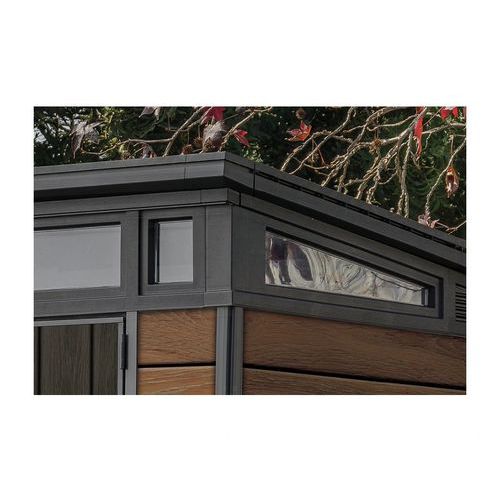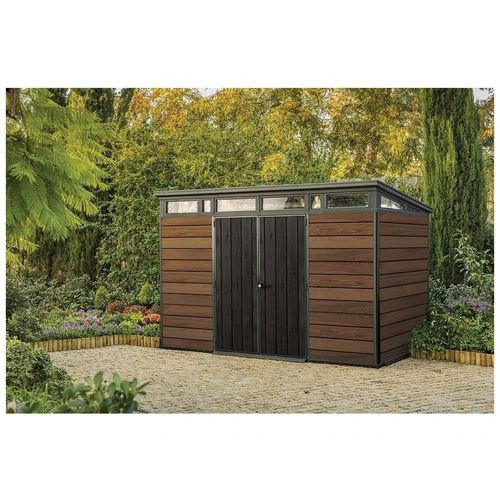 Karbantartásmentes, barna műanyag kivitelű Horizontal kerti fészer a rendkívül korszerű, fahatású Decocoat anyagból. Robusztus szerkezetű dupla falakkal és fém merevítőkkel. Szilárd tetővel, széles, 140 x 182 cm méretű dupla ajtóval és kiemelkedően nagy, 150 kg/m2 teherbírású padlóval. A fészer merevített acélszerkezetének köszönhetően rendkívül stabil. Szerszámok, kerti kiegészítők, fűnyíró vagy grillsütő tárolására kitűnően használható. Maximális tetőterhelés: 150 kg/m2, szélállóság: 145 km/h-ig (rögzített fészer esetén érvényes). További előnyei közé tartoznak az ablakok, tetőablakok, magas padló és retesz.
