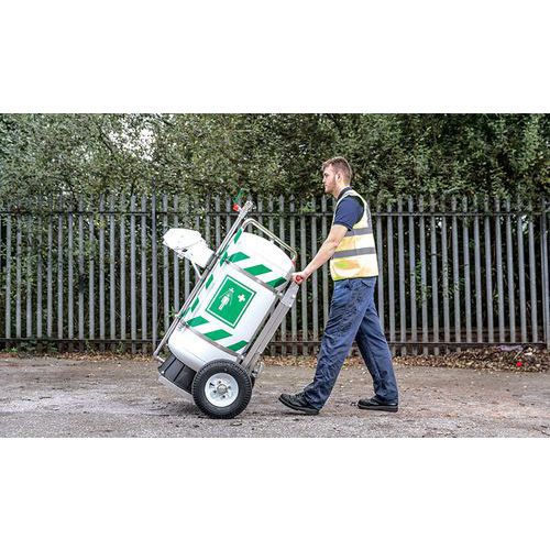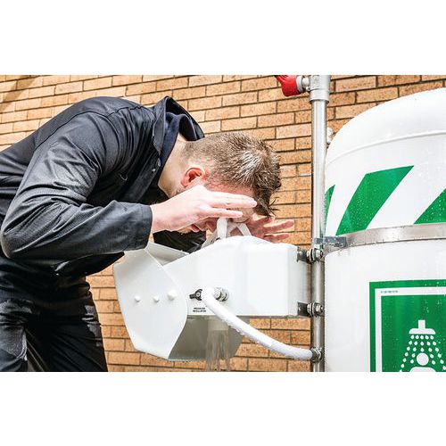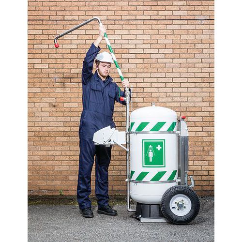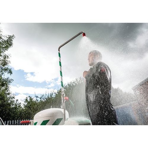 Mozgatható zuhany gyors beavatkozáshoz veszélyes anyaggal való érintkezés esetén. Szem, arc és test mosására. 114 literes tartállyal. A szerkezet rozsdamentes acélból, a tartály szigetelt polipropilénből készült. A nagy gumikerekeknek köszönhetően terepen is kényelmesen mozgatható. Maximális üzemi hőmérséklet 0 és 40 °C között. A zuhany mérete összecsukott állapotban: 835 x 1 220 x 1 450 mm, a zuhany mérete nyitott állapotban: 835 x 1 421 x 2 400 mm. Az UK készült