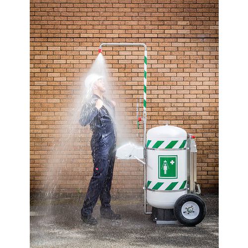 Mozgatható zuhany gyors beavatkozáshoz veszélyes anyaggal való érintkezés esetén. Szem, arc és test mosására. 114 literes tartállyal. A szerkezet rozsdamentes acélból, a tartály szigetelt polipropilénből készült. A nagy gumikerekeknek köszönhetően terepen is kényelmesen mozgatható. Maximális üzemi hőmérséklet 0 és 40 °C között. A zuhany mérete összecsukott állapotban: 835 x 1 220 x 1 450 mm, a zuhany mérete nyitott állapotban: 835 x 1 421 x 2 400 mm.