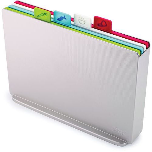 4 darab vágódeszkából álló készlet magasított élekkel- 8,3x34,6x 27,3cm-es méretek. Színkódolt rendszer csökkenti a keresztszennyeződés kockázatát. A deszkák és az állvány csúszásmentes lábakkal rendelkeznek A perem felfogja a morzsákat vagy folyadékot Mosogatógépben mosható.