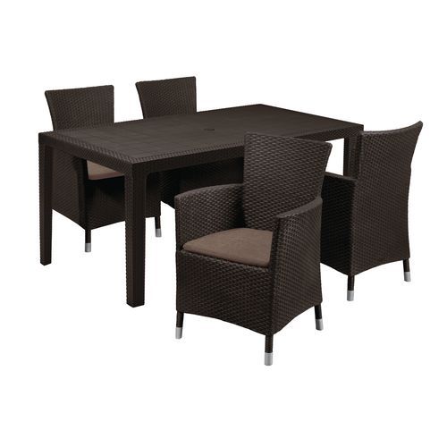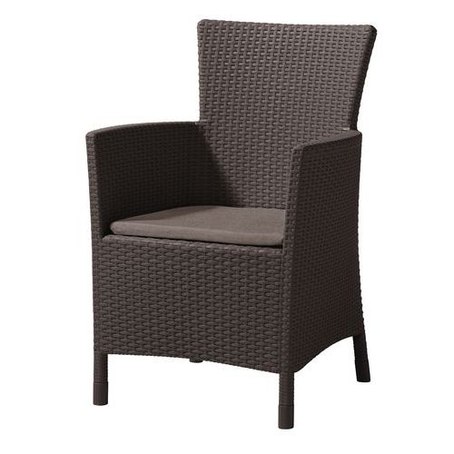 Modern karosszék a kertbe, teraszra vagy erkélyre a kényelmes ülőalkalmatossághoz. A kényelemről a szilárd karfák és a puha ülőpárna gondoskodik. Rattan utánzatú műanyagból készült. Időjárás- és UV-álló.