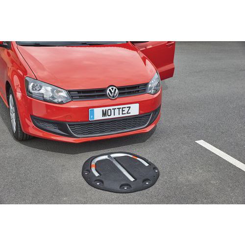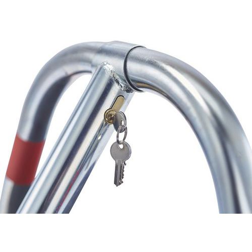 Európai zárral, 2 kulccsal zárható. Ütésállóság 20 tonnáig. Nagyon erős ív van beágyazva egy gumi alapba (újrahasznosított gumiból készült gumi) Horganyzott anyag.