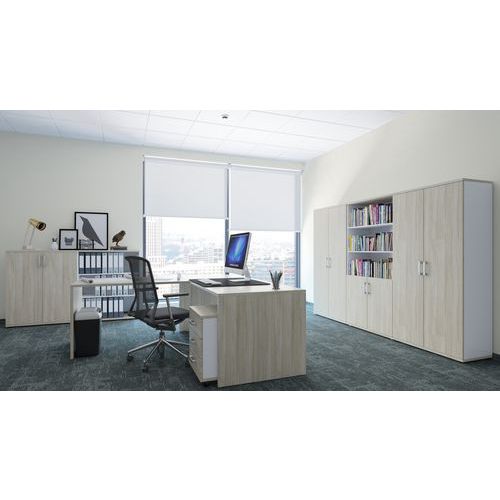 Munkaasztalok irodákba és munkahelyekre. Az asztalláb 25 mm vastag farostlemezből készült, az asztal hátsó keresztlemez merevítésű fehér vagy szürke kivitelben. Az asztallap 2 mm vastag ABS éllel rendelkezik. Választható dekor bükk/szürke, szonoma tölgy/fehér vagy oyster tölgy/fehér változatban. Az asztal toldóelemmel bővíthető a nagyobb munkafelület érdekében.