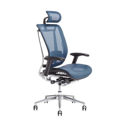 Kárpitozott irodai szék anatómiai formázott ülőlappal és szitaszövetes háttámlával.