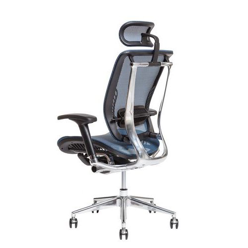 Kárpitozott irodai szék anatómiai formázott ülőlappal és szitaszövetes háttámlával.