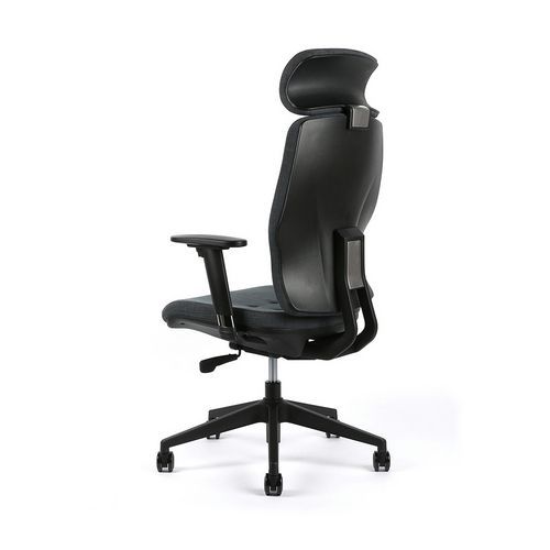 Szövet kárpitozású irodai szék fejtámlával és kartámlával.