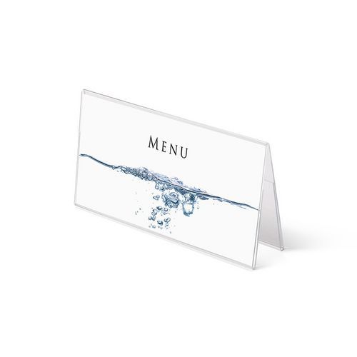 A alakú műanyag pultos prezentációs állványok plexiüvegből. Alkalmas állványként éttermi menükre. Fekvő tájolás. Kétoldalas nézet.