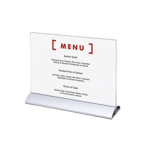 Műanyag pultos prezentációs állványok. Erős alumínium alapzat. Alkalmas állványként éttermi menükre. Fekvő tájolás. Az állvány alapkivitelben nyomat nélkül kerül szállításra.