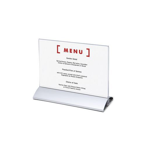 Műanyag pultos prezentációs állványok. Erős alumínium alapzat. Alkalmas állványként éttermi menükre. Fekvő tájolás. Az állvány alapkivitelben nyomat nélkül kerül szállításra.