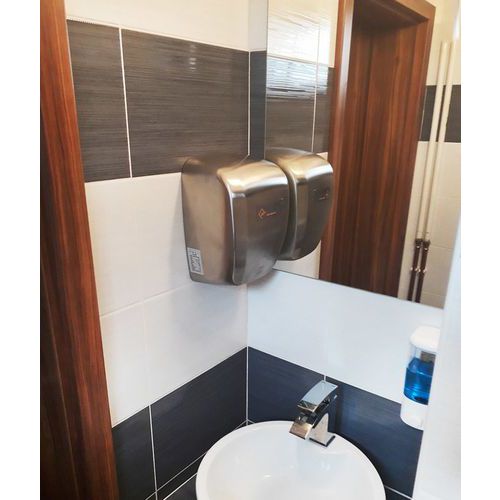 A levegő porszűrőn keresztül kerül a szárítóba, a meleg levegő pedig keskeny, hosszúkás fúvókából jön ki, amely nemcsak szárítja, hanem meg is törli a kezeket.
