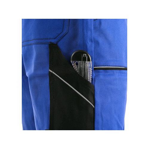 Férfi kezeslábas előke - rövidített változat 170-176 cm magasságra. Mellzseb cipzárral, elasztikus derékrész hátul, elülső zsebek, oldalsó zseb mérőszalaghoz / lehajtható mérőszalaghoz, oldalzseb mobiltelefonnak / pénztárcának, dupla térd, hátsó zseb füllel, Méret: 44-64 Külső anyag: 100% pamut Fényvisszaverő kiegészítők: Igen Termék hossza: Rövid méret 170-176 cm Szín: Kék