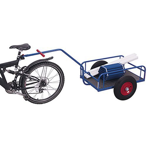 Kézzel mozgatható, kétkerekű kocsi kerékpárra rögzítéshez. Gömbfejjel és műanyag konzollal szállítjuk a kerékcsőhöz való rögzítéshez. 26 - 31 mm átmérőjű csövekhez. A kocsi maximális teherbírása kerekenként 40 kg. Ragasztható, vízálló rétegelt lemezből készült rakodófelület csúszásgátló felülettel. 220 mm magas oldalsó korlátok. Felfújható gumiabroncsok acél felnin, golyóscsapágyakkal. Vázfelület-kezelés RAL skála szerinti porfestékkel. Ütés- és karcálló.