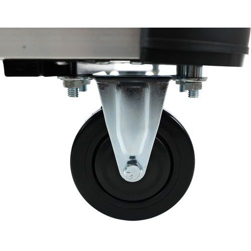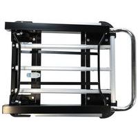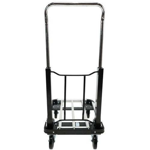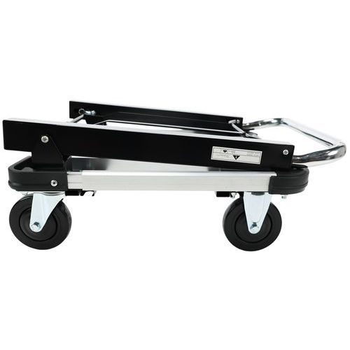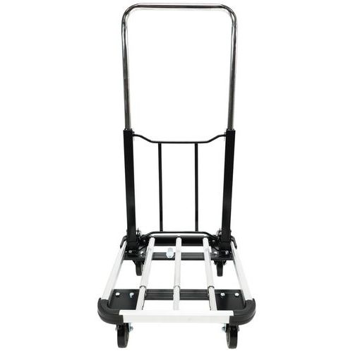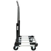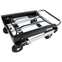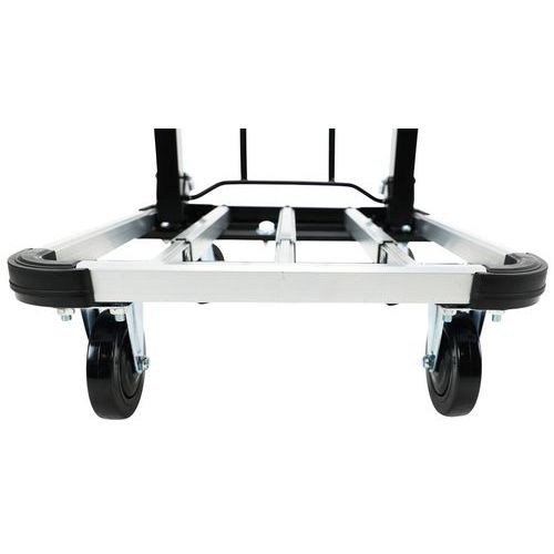Alumínium kézikocsi teleszkópos fogantyúval. A teleszkópos fogantyú két pozícióba állítható. A plató 4 sarkán PVC ütközésvédelem található. A mozgatást 100 mm átmérőjű poliamid kerekek biztosítják, melyekből kettő fix és kettő fékezhető, önbeálló.