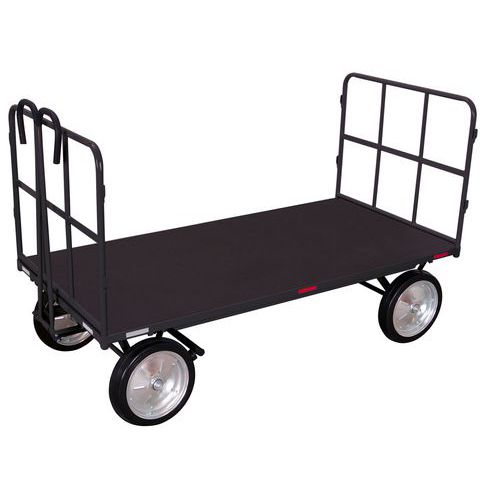 Acél kézikocsi két cső alakú oldalpanellel az elülső oldalakon, falmagasság 750 mm. Puha markolatú húzófogantyú. Fényvisszaverő elemek acélszerkezeten. Automatikus első rögzítőfék és automatikus lágy visszatérés nyugalmi helyzetbe. Csúszásgátló felületű, vízálló, ragasztott rétegelt lemezből készült rakodófelület. Felfújható vagy tömör gumi kerekek műanyag felnin, golyóscsapágyakkal. Vázfelület-kezelés RAL skála szerinti porfestékkel. Ütés- és karcálló. CE : nincs Teherbírás (kg) : 1250 kg