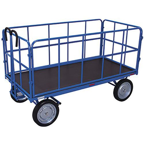 Acél kézikocsi négy cső alakú oldalpanellel, falmagasság 750 mm. Puha markolatú húzófogantyú. Fényvisszaverő elemek acélszerkezeten. Automatikus első rögzítőfék és automatikus lágy visszatérés nyugalmi helyzetbe. Csúszásgátló felületű, vízálló, ragasztott rétegelt lemezből készült rakodófelület. Felfújható vagy tömör gumi kerekek műanyag felnin, golyóscsapágyakkal. Vázfelület-kezelés RAL skála szerinti porfestékkel. Ütés- és karcálló. CE : nincs Teherbírás (kg) : 1250 kg