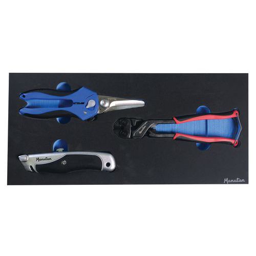 - Szerszámkészlet habmodulban. Tapétavágót, csípőfogót és karos ollót tartalmaz.