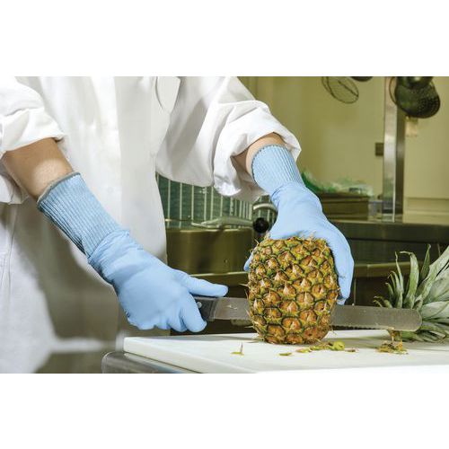 Kötött kesztyű kiváló vágásállósággal. Hosszú mandzsetta a megerősített alkarvédelemért. A kesztyűk teljesítménye akár 20 tisztítási ciklusig garantált. A mosás nyomon követhető egy speciális címkével, amely nyomon követi a mosások számát. Minden típusú élelmiszerrel érintkezhet.