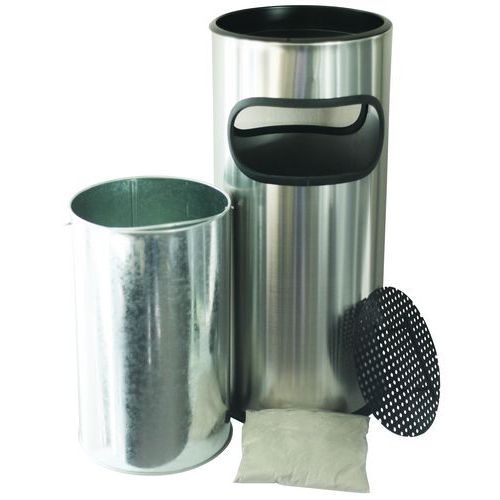 Tűzálló henger alakú kültéri hamutartós szemétkosár. Fém betét füllel a szemétkosár könnyű ürítésére. Oldalsó szemétbedobó nyílás. Alkalmas kültéri felfüggesztett elhelyezésre.