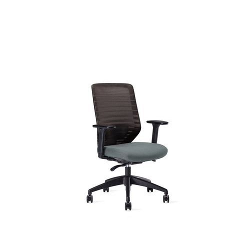 Irodai forgószék szinkronmechanikával. Többszínű kárpitozott ülőlappal, háttámlája csíkos hálóval burkolt, amely biztosítja a szellőzést. Mind az ülőlap, mind a háttámla 4 pozícióban rögzíthető. Az ülőmagasság és mélység egyénileg szabályozható az optimális lábtartás érdekében. Állítható ergonomikus deréktámasszal. Állítható magasságú kartámaszokkal. Stabil ötkarú, műanyag lábkereszttel. Lágy futófelületű kerekekkel kemény padlón vagy szőnyegen való használatra. A szék kiegészíthető állítható fejtámlával. BIFMA tanúsítvánnyal. A szinkronmechanika biztosítja, hogy az ülőlap és a háttámla állandóan érintkezzen a széket használó személy hátával. A szék ülőlapja követi a háttámla döntését, így bármilyen dőlésszög ergonomikus üléspozíciót biztosít. A mechanika mozgása a kívánt helyzetben rögzíthető. Állítható nyomóerővel és ülőlap magassággal.