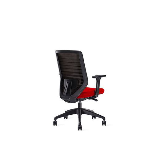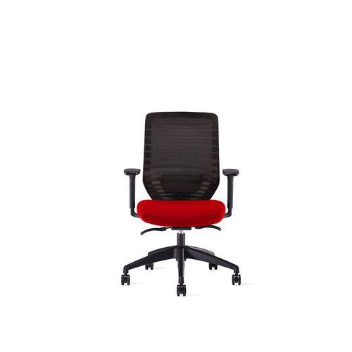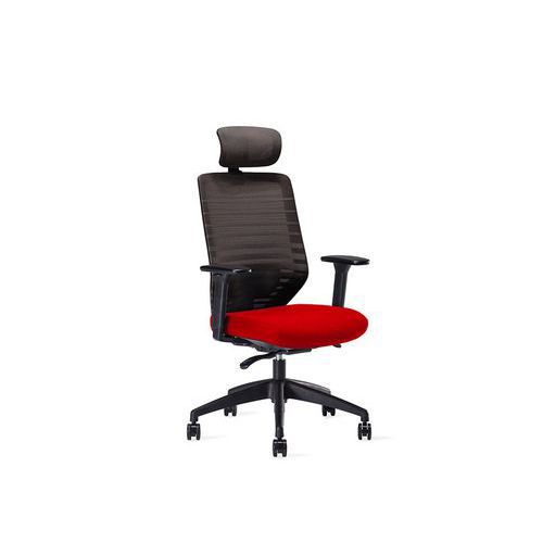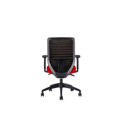 Irodai forgószék szinkronmechanikával. Többszínű kárpitozott ülőlappal, háttámlája csíkos hálóval burkolt, amely biztosítja a szellőzést. Mind az ülőlap, mind a háttámla 4 pozícióban rögzíthető. Az ülőmagasság és mélység egyénileg szabályozható az optimális lábtartás érdekében. Állítható ergonomikus deréktámasszal. Állítható magasságú kartámaszokkal. Stabil ötkarú, műanyag lábkereszttel. Lágy futófelületű kerekekkel kemény padlón vagy szőnyegen való használatra. A szék kiegészíthető állítható fejtámlával. BIFMA tanúsítvánnyal. A szinkronmechanika biztosítja, hogy az ülőlap és a háttámla állandóan érintkezzen a széket használó személy hátával. A szék ülőlapja követi a háttámla döntését, így bármilyen dőlésszög ergonomikus üléspozíciót biztosít. A mechanika mozgása a kívánt helyzetben rögzíthető. Állítható nyomóerővel és ülőlap magassággal.