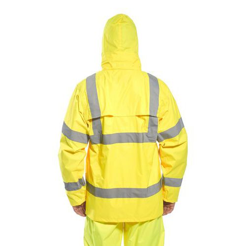 Minden időben láthatóvá teszi viselőjét és teljes eső elleni védelmet biztosít. A H441 esőnadrággal kombinálható. Könnyen összetekerhető a tároláshoz. CE minősítés Szellőzőnyílások Fényvisszaverő szalag UPF 50+ Belső gumírozott mandzsetta Szélálló Állítható szegély Mély tárolózsebek Ragasztott varrások 2 zseb Rejtett kapucni XS-5XL Texpel Splash Bio mozgó szalag