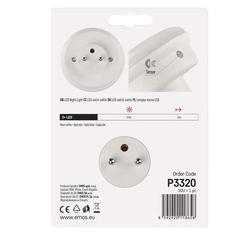 | Termék neve | LED-es éjjeli lámpa P3320 foglalathoz, fényérzékelővel |