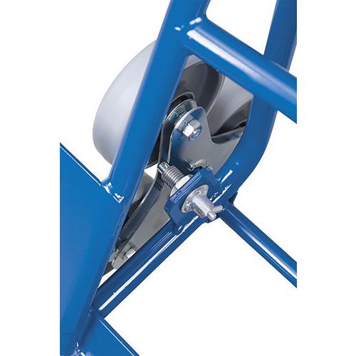 Háromküllős csillagkerekekkel ellátott lépcsőházi kocsi szürke foltmentes, hőre lágyuló gumiabroncsokból. Vödör mérete 300 x 255 mm. Két ívelt fogantyú biztonsági fogantyúkkal. Kerekek műanyag peremen, precíziós golyóscsapágyakkal. Keret felületkezelés porfestékkel RAL skála szerint. Ütés- és karcálló. Teherbírás (kg) : 200 kg
