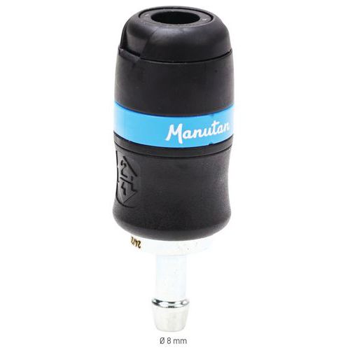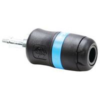 Biztonsági gyorscsatlakozó kör alakú csatalakozással. Kompozit anyagból készült, nem tartalmaz szilikont. Nagyon könnyű, kopás-, ütés, zúzódás- és rezgésálló. Profil ISO 6150 B. Az áthaladás Ø 6 mm, tömlőkimenet 8 mm, áramlás 833 l/perc, maximális nyomás 16 bar.