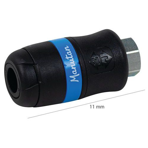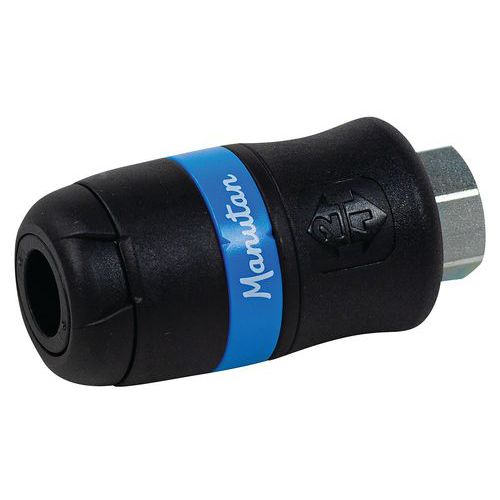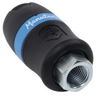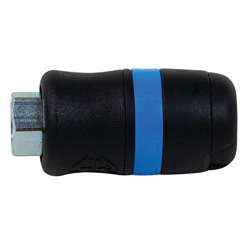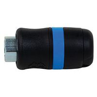 Biztonsági gyorscsatlakozó kör alakú csatalakozással. Kompozit anyagból készült, nem tartalmaz szilikont. Nagyon könnyű, kopás-, ütés, zúzódás- és rezgésálló. Profil ISO 6150 B. Az áthaladás Ø 6 mm, tömlőkimenet 8 mm, áramlás 833 l/perc, maximális nyomás 16 bar.