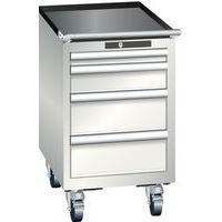 Mobil műhelyfiókos szekrények, Lista, 4 vagy 5 fiókkal. Bordázott csúszásgátló alátét a szekrény tetején. A mozgást 4 kerék és egy fogantyú teszi lehetővé. Kulcsos zár. Optimális használat a teljes kihúzásnak és az optimális fiókelőlap-magasságnak köszönhetően. Kiváló védelem a por, folyadékok és mechanikai kopás ellen a zárt keretnek köszönhetően, amelynek felülete ütés- és kopásálló. Borulásgátló rendszer, amely megakadályozza a fiók leesését, és egyedi fiókzár. Korrózióvédelem elektroforetikus merítéses festéssel és szórással. Optimalizált tárolóhely és rendszerezés a minden egyes alkalmazáshoz igazított LISTA elválasztóknak és a hornyokkal és perforációkkal ellátott fiókoknak köszönhetően. Professzionális címkézés LISTA Script címkézőszoftverrel és felhajtható címketartóval. Tökéletesen csendes mozgás a keresztléc nélküli csúszkának köszönhetően. A fiókelválasztók nem tartozékok. Külön kell megvásárolni.