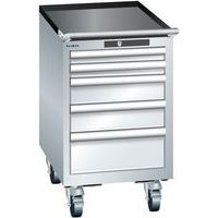 Mobil műhelyfiókos szekrények, Lista, 4 vagy 5 fiókkal. Bordázott csúszásgátló alátét a szekrény tetején. A mozgást 4 kerék és egy fogantyú teszi lehetővé. Kulcsos zár. Optimális használat a teljes kihúzásnak és az optimális fiókelőlap-magasságnak köszönhetően. Kiváló védelem a por, folyadékok és mechanikai kopás ellen a zárt keretnek köszönhetően, amelynek felülete ütés- és kopásálló. Borulásgátló rendszer, amely megakadályozza a fiók leesését, és egyedi fiókzár. Korrózióvédelem elektroforetikus merítéses festéssel és szórással. Optimalizált tárolóhely és rendszerezés a minden egyes alkalmazáshoz igazított LISTA elválasztóknak és a hornyokkal és perforációkkal ellátott fiókoknak köszönhetően. Professzionális címkézés LISTA Script címkézőszoftverrel és felhajtható címketartóval. Tökéletesen csendes mozgás a keresztléc nélküli csúszkának köszönhetően. A fiókelválasztók nem tartozékok. Külön kell megvásárolni. Max. terhelés (kg) : 75 kg