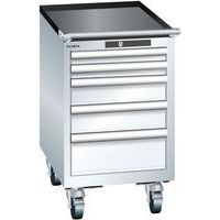 Mobil műhelyfiókos szekrények, Lista, 4 vagy 5 fiókkal. Bordázott csúszásgátló alátét a szekrény tetején. A mozgást 4 kerék és egy fogantyú teszi lehetővé. Kulcsos zár. Optimális használat a teljes kihúzásnak és az optimális fiókelőlap-magasságnak köszönhetően. Kiváló védelem a por, folyadékok és mechanikai kopás ellen a zárt keretnek köszönhetően, amelynek felülete ütés- és kopásálló. Borulásgátló rendszer, amely megakadályozza a fiók leesését, és egyedi fiókzár. Korrózióvédelem elektroforetikus merítéses festéssel és szórással. Optimalizált tárolóhely és rendszerezés a minden egyes alkalmazáshoz igazított LISTA elválasztóknak és a hornyokkal és perforációkkal ellátott fiókoknak köszönhetően. Professzionális címkézés LISTA Script címkézőszoftverrel és felhajtható címketartóval. Tökéletesen csendes mozgás a keresztléc nélküli csúszkának köszönhetően. A fiókelválasztók nem tartozékok. Külön kell megvásárolni.