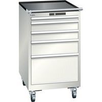 Bordázott csúszásgátló alátét a szekrény tetején. Védelem por és folyadékok ellen a zárt keretnek köszönhetően, amely ütés- és kopásálló felülettel rendelkezik. Biztonsági zár a fiókok leesése és egyedi zárása érdekében (borulásvédelem). Korrózióvédelem elektroforetikus immerziós festéssel és szórással. Professzionális címkézés LISTA Script címkézőszoftverrel és felhajtható címkebehelyező fogantyúval. A mozgást 4 kerék és egy fogantyú teszi lehetővé. Kulcsos zár. Tökéletesen csendes mozgás a keresztléc nélküli csúszkának köszönhetően.