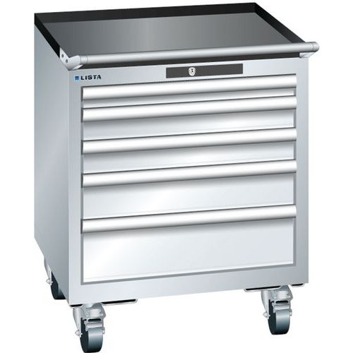 Bordázott csúszásgátló alátét a szekrény tetején. 4 kerék és egy fogantyú teszi lehetővé a mozgást. Védelem a por és folyadékok ellen a zárt keretnek köszönhetően, amely ütés- és kopásálló felülettel rendelkezik. Biztonsági zár a fiókok leesése és egyedi zárása érdekében (borulásvédelem). Korrózióvédelem elektroforetikus immerziós festéssel és szórással. Professzionális jelölés LISTA Script jelölőszoftverrel. Felhajtható fogantyúk címkék behelyezéséhez. Tökéletesen csendes mozgás a keresztléc nélküli csúszkának köszönhetően. Kulcsos zár. Max. terhelés (kg) : 75 kg