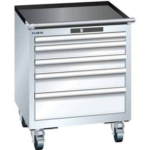 Bordázott csúszásgátló alátét a szekrény tetején. 4 kerék és egy fogantyú teszi lehetővé a mozgást. Védelem a por és folyadékok ellen a zárt keretnek köszönhetően, amely ütés- és kopásálló felülettel rendelkezik. Biztonsági zár a fiókok leesése és egyedi zárása érdekében (borulásvédelem). Korrózióvédelem elektroforetikus immerziós festéssel és szórással. Professzionális jelölés LISTA Script jelölőszoftverrel. Felhajtható fogantyúk címkék behelyezéséhez. Tökéletesen csendes mozgás a keresztléc nélküli csúszkának köszönhetően. Kulcsos zár.