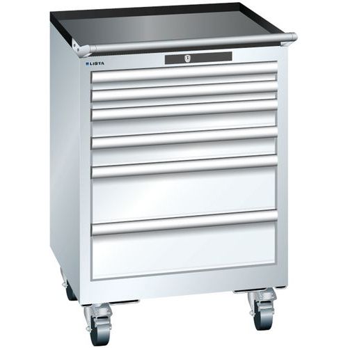 Bordázott csúszásgátló alátét a szekrény tetején. 4 kerék és egy fogantyú teszi lehetővé a mozgást. Védelem a por és folyadékok ellen a zárt keretnek köszönhetően, amely ütés- és kopásálló felülettel rendelkezik. Biztonsági zár a fiókok leesése és egyedi zárása érdekében (borulásvédelem). Korrózióvédelem elektroforetikus immerziós festéssel és szórással. Professzionális jelölés LISTA Script jelölőszoftverrel. Felhajtható fogantyúk címkék behelyezéséhez. Tökéletesen csendes mozgás a keresztléc nélküli csúszkának köszönhetően. Kulcsos zár.