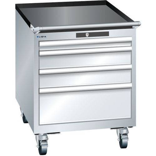 Bordázott csúszásgátló alátét a szekrény tetején. Védelem por és folyadékok ellen a zárt keretnek köszönhetően, amely ütés- és kopásálló felülettel rendelkezik. Biztonsági zár a fiókok leesése és egyedi zárása érdekében (borulásvédelem). Korrózióvédelem elektroforetikus immerziós festéssel és szórással. Professzionális címkézés LISTA Script címkézőszoftverrel és felhajtható címkebehelyező fogantyúval. Tökéletesen csendes mozgás a keresztléc nélküli csúszkának köszönhetően. A mozgást 4 kerék és egy fogantyú teszi lehetővé. Kulcsos zár.