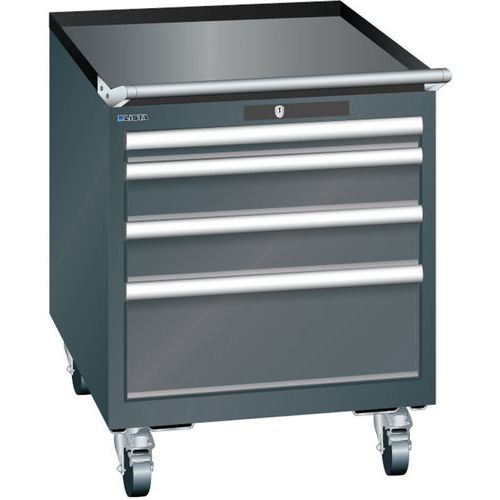 Bordázott csúszásgátló alátét a szekrény tetején. Védelem por és folyadékok ellen a zárt keretnek köszönhetően, amely ütés- és kopásálló felülettel rendelkezik. Biztonsági zár a fiókok leesése és egyedi zárása érdekében (borulásvédelem). Korrózióvédelem elektroforetikus immerziós festéssel és szórással. Professzionális címkézés LISTA Script címkézőszoftverrel és felhajtható címkebehelyező fogantyúval. Tökéletesen csendes mozgás a keresztléc nélküli csúszkának köszönhetően. A mozgást 4 kerék és egy fogantyú teszi lehetővé. Kulcsos zár. Max. terhelés (kg) : 75 kg