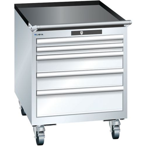 Bordázott csúszásgátló alátét a szekrény tetején. Védelem por és folyadékok ellen a zárt keretnek köszönhetően, amely ütés- és kopásálló felülettel rendelkezik. Biztonsági zár a fiókok leesése és egyedi zárása érdekében (borulásvédelem). Korrózióvédelem elektroforetikus immerziós festéssel és szórással. Professzionális címkézés LISTA Script címkézőszoftverrel és felhajtható címkebehelyező fogantyúval. Tökéletesen csendes mozgás a keresztléc nélküli csúszkának köszönhetően. A mozgást 4 kerék és egy fogantyú teszi lehetővé. Kulcsos zár. Max. terhelés (kg) : 75 kg